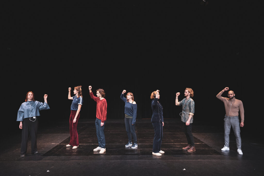 VICTOR HEEFT ZIJN TROUWRING OPGEZOGEN is a live performance where unrehearsed actors follow real-time instructions, turning everyday moments into playful yet profound existential questions.