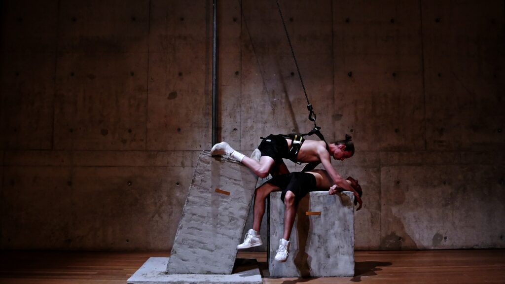 FRAGILE MONUMENTS is a performative installation in which two “human statues” form fleeting images of intimacy.