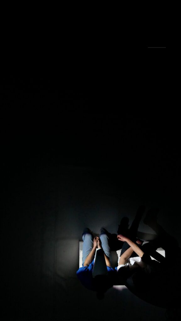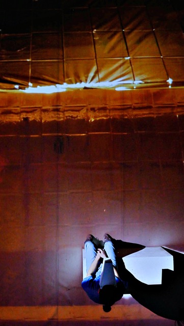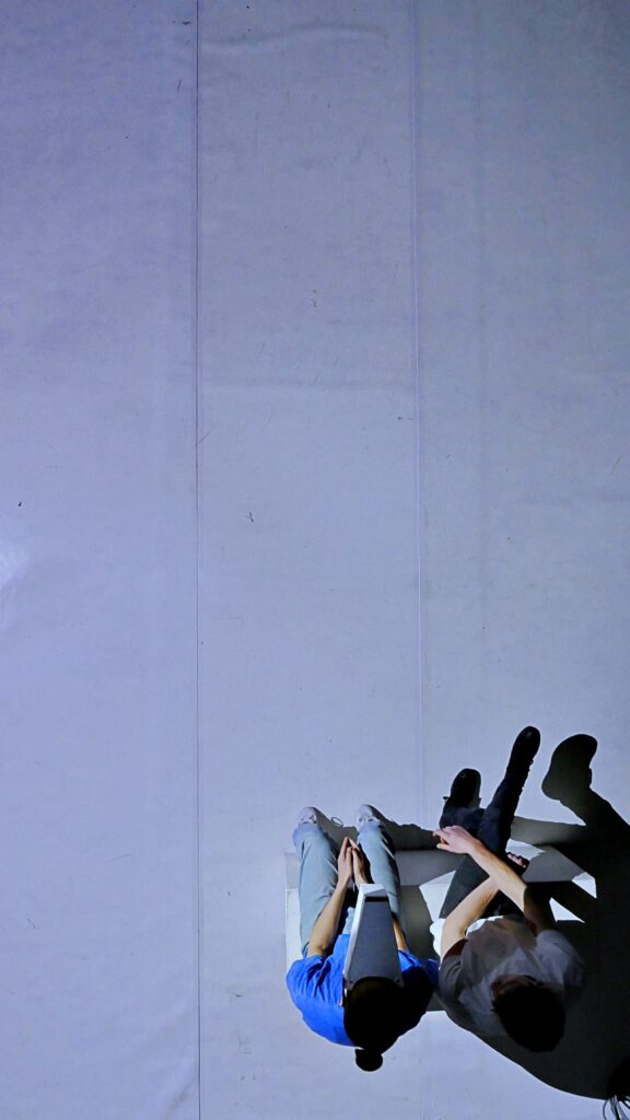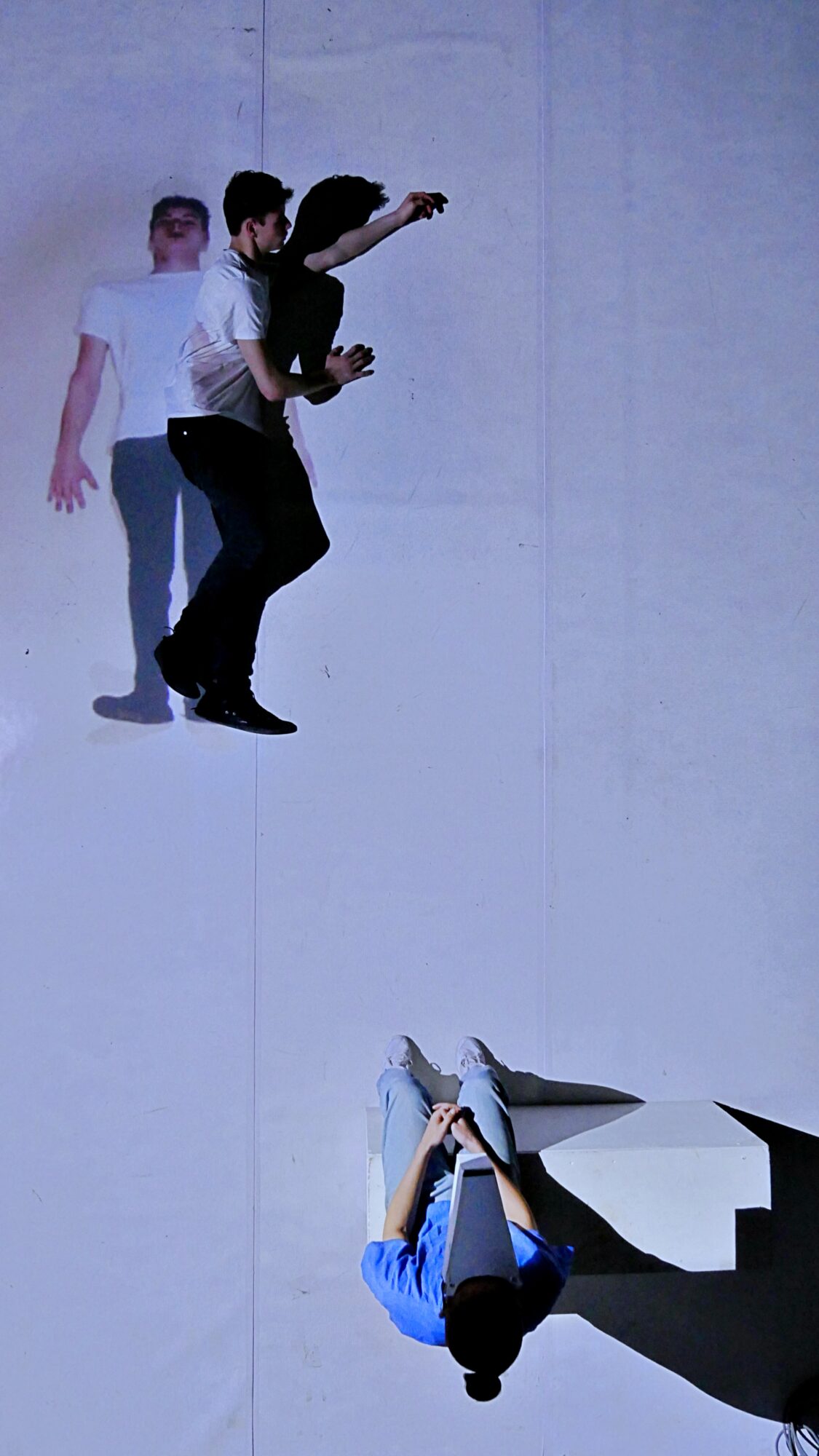 At the same time, a performer whispers a monologue into the visitor’s ear. The voice feels close, personal, in contrast to the detached overhead view. Video projections spread across the white floor, creating visual layers that shift and overlap as the participant moves.